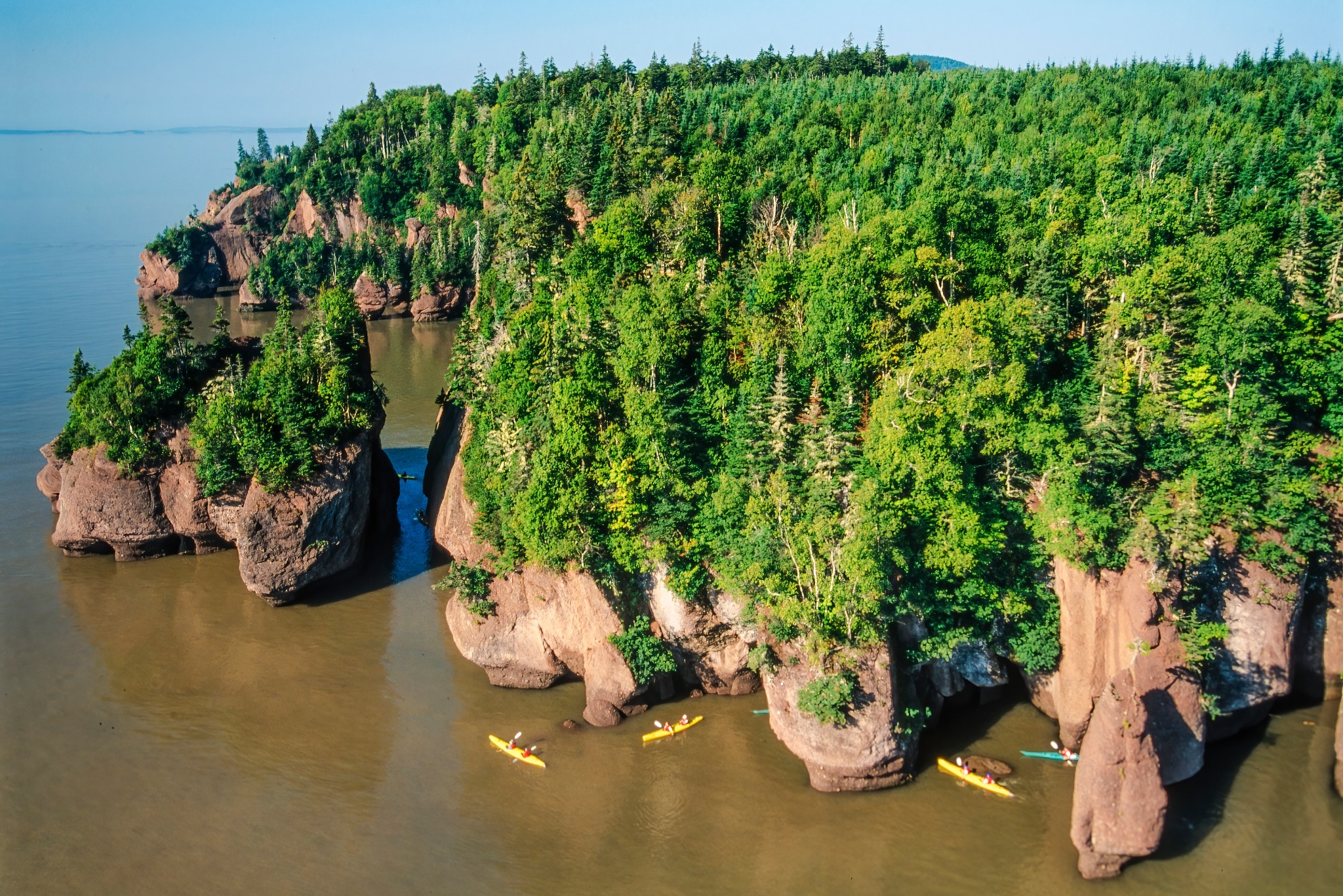Bij aankomst in Hopewell Cape draait alles om de beroemde Hopewell Rocks. Het is slim om je bezoek af te stemmen op het getij. Bij eb kun je letterlijk over de zeebodem lopen tussen de hoge rotsformaties door. Een paar uur later staat hetzelfde gebied volledig onder water. Het verschil kan oplopen tot meer dan 10 meter, wat het een van de grootste getijdenverschillen ter wereld maakt.