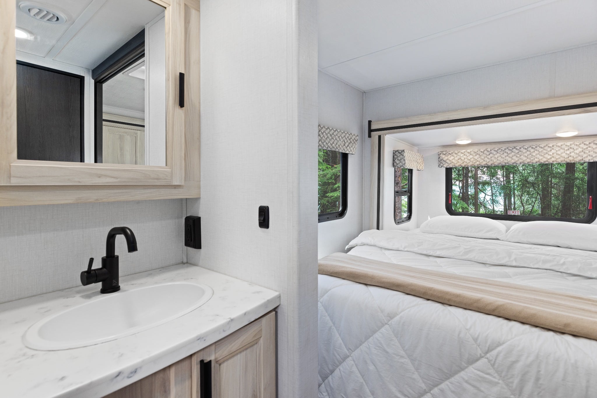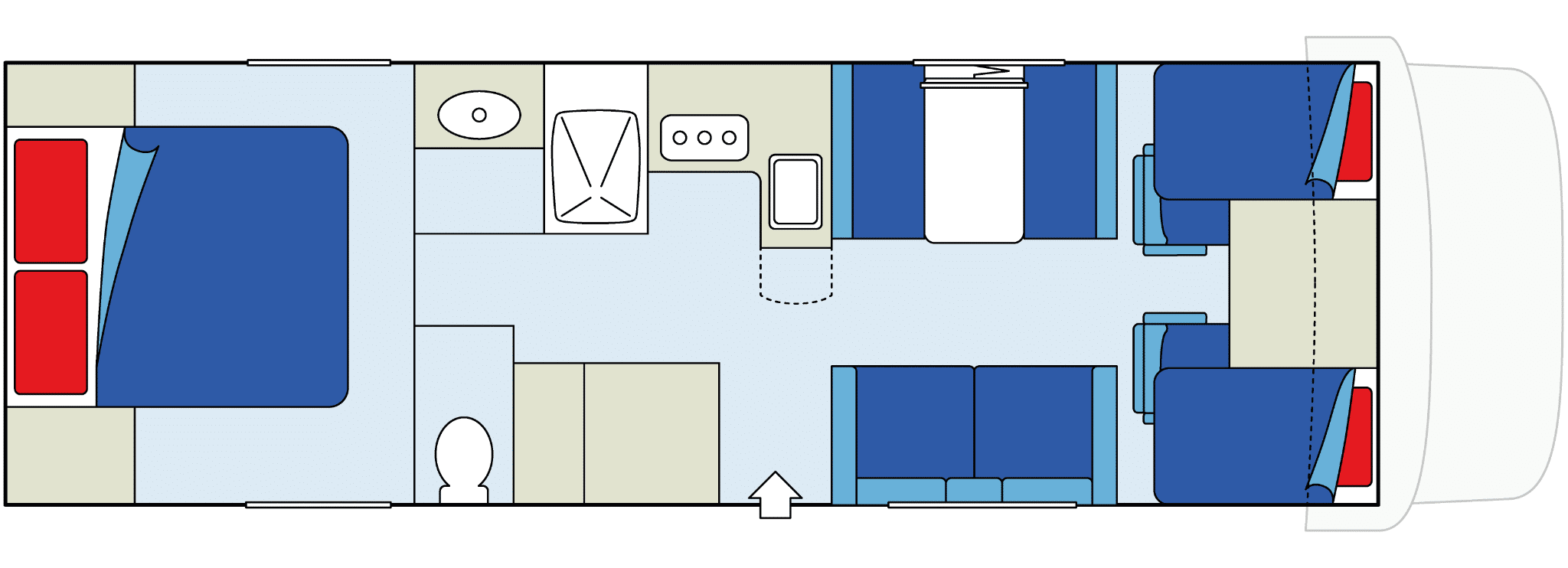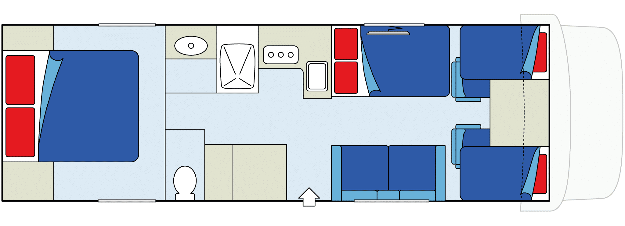 Achterin vind je een vast queen bed, boven de cabine twee aparte eenpersoonsbedden en de dinette kan worden omgebouwd tot extra slaapplaats. In totaal is er ruimte voor vier volwassenen en twee kinderen. De keuken is volledig uitgerust, de badkamer is afgesloten en dankzij generator en zonnepaneel ben je flexibel in je overnachtingsplekken.