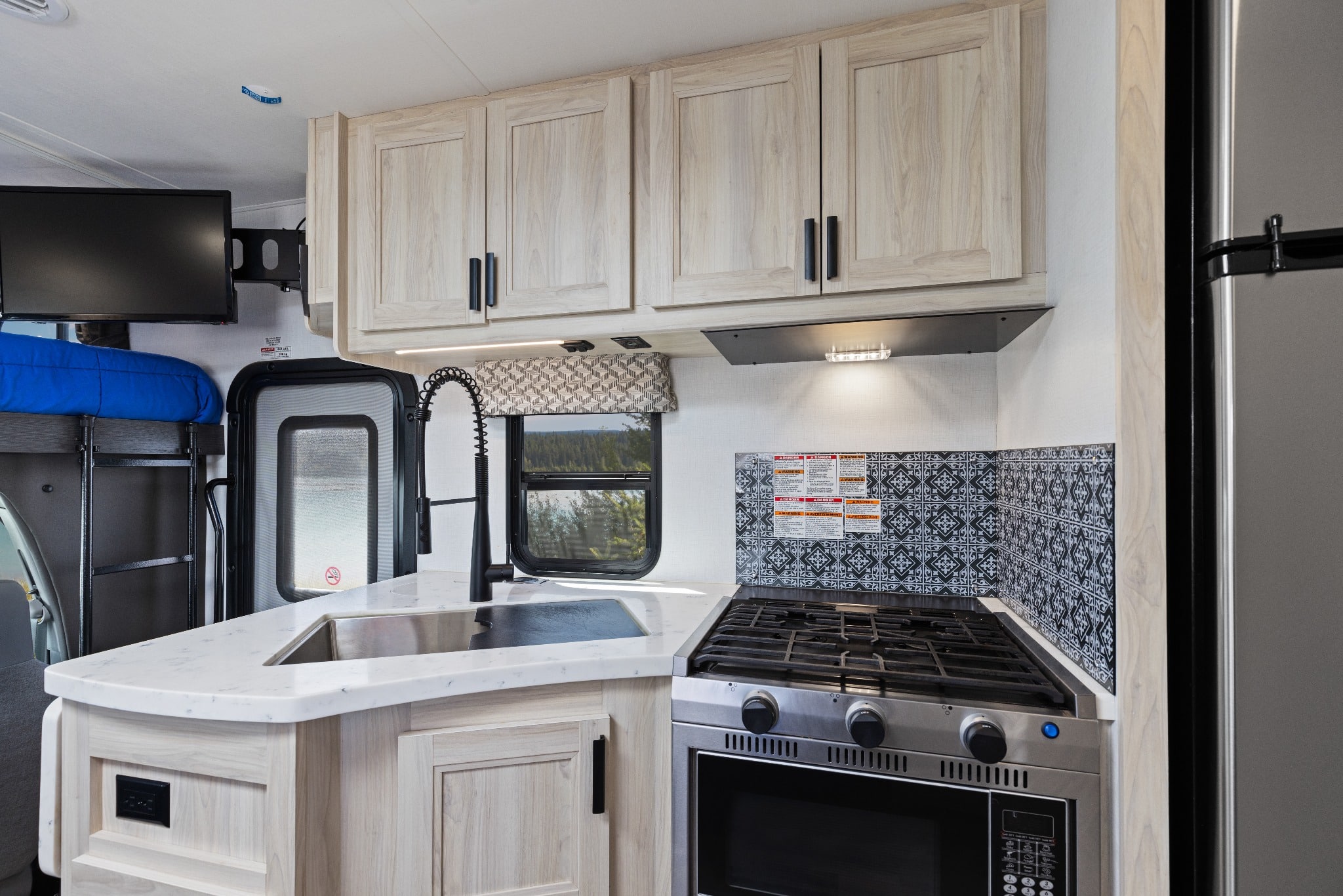 De keuken is volledig ingericht met 3-pits fornuis, convection magnetron, koelkast met vriesvak en voldoende kastruimte. De verswatertank van 167 liter maakt het mogelijk om enkele dagen zonder volledige aansluitingen te staan.