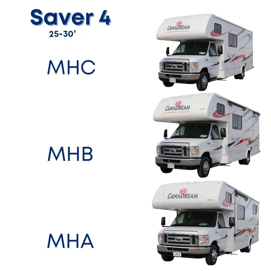 De Canadream Saver 4 is bedoeld voor gezinnen of reisgezelschappen die meer ruimte nodig hebben tijdens hun rondreis door Canada. In plaats van een vast campermodel boek je een categorie. Vijf dagen voor vertrek hoor je via de online check-in welk voertuig je krijgt toegewezen. Dit kan een MHC (Compact Motorhome), MHB (Midi Motorhome) of MHA (Maxi Motorhome) zijn.