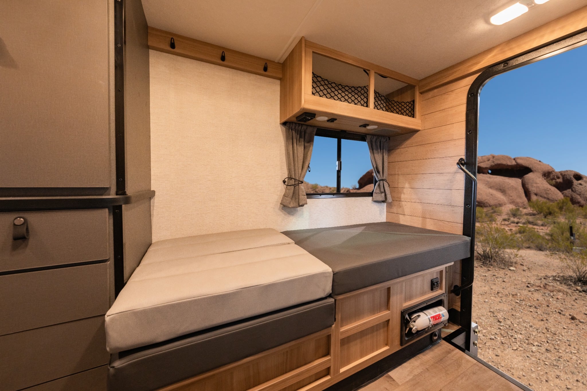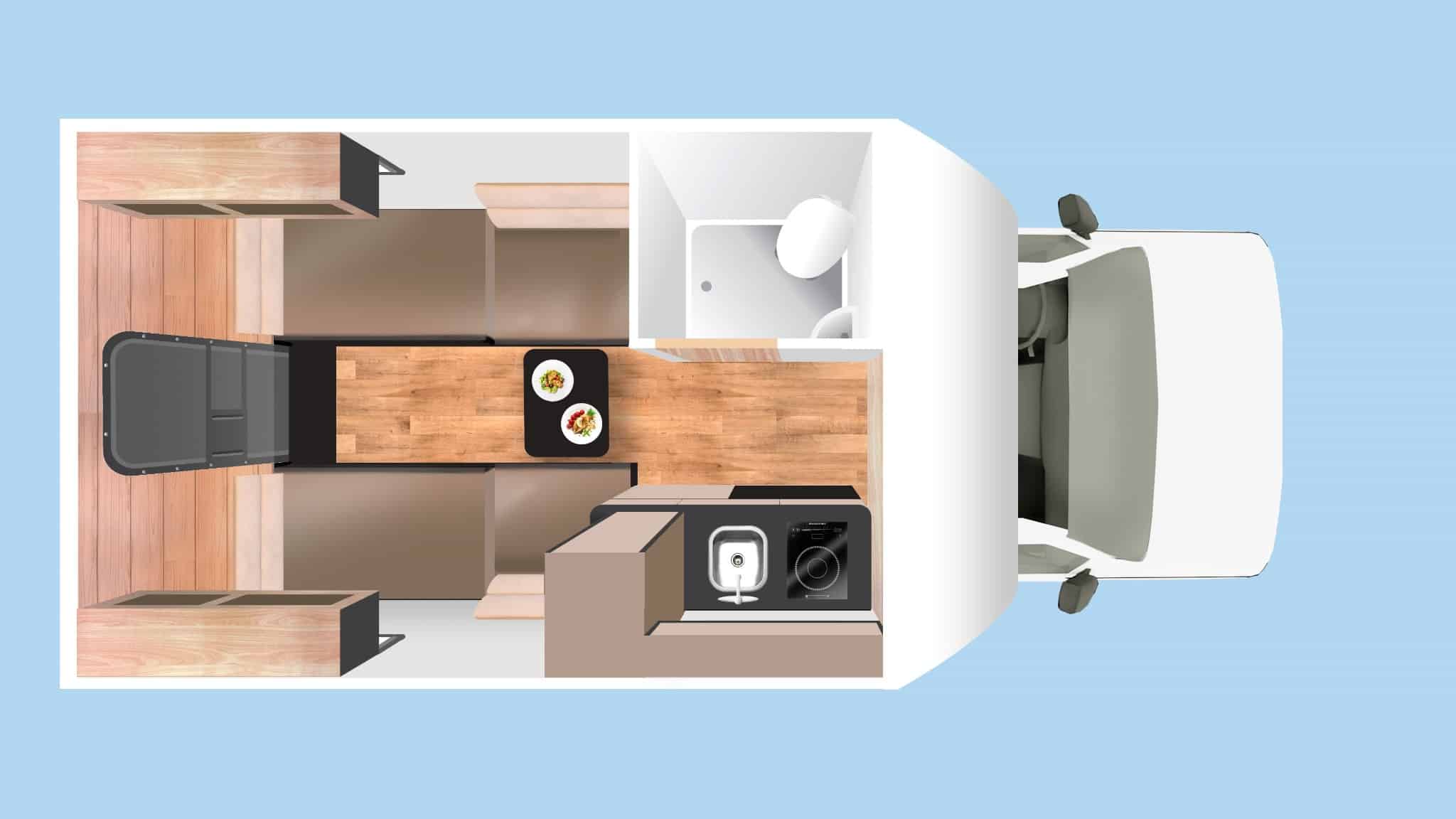 Binnenin vind je de slaapruimte achterin: de zitruimte bouw je elke avond om tot een fijn tweepersoonsbed. Overdag heb je een eettafel voor twee, een eenvoudig keukentje met elektrische kookplaat, koelkast en spoelbak, en een toilet met douche. Alles overzichtelijk ingedeeld en verrassend comfortabel voor het formaat.