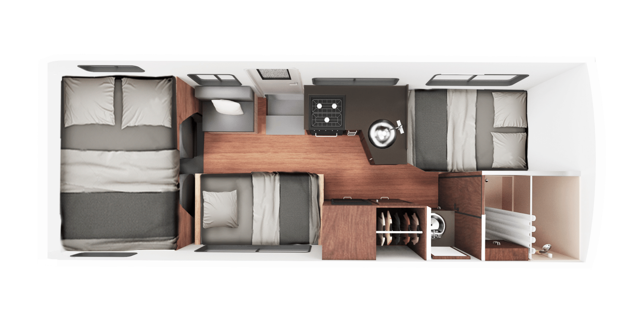 In de praktijk merk je het verschil vooral in gemak. Je hoeft geen banken om te bouwen of elke avond opnieuw je bed klaar te maken. De Cruise Canada C25 heeft twee vaste tweepersoonsbedden: eentje achterin en eentje boven de cabine. De eethoek kan desgewenst worden omgebouwd tot extra slaapplek voor een kind of lichte volwassene. Daardoor is de camper ook geschikt voor gezinnen met drie kinderen of vier volwassenen plus kind.