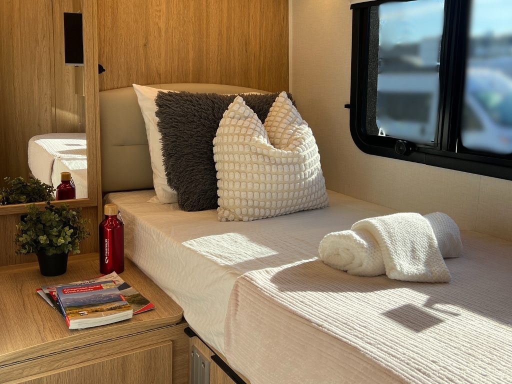 De compacte indeling van de Fraserway B+ Premium zorgt ervoor dat je de dinnette in de avond kunt ombouwen tot één groot kingsize bed. Of als je als vrienden op pad bent behoud je de banken en zijn het twee fijne aparte bedden. Heerlijk uitrusten na een dag onderweg en bijkomen van alle indrukken.