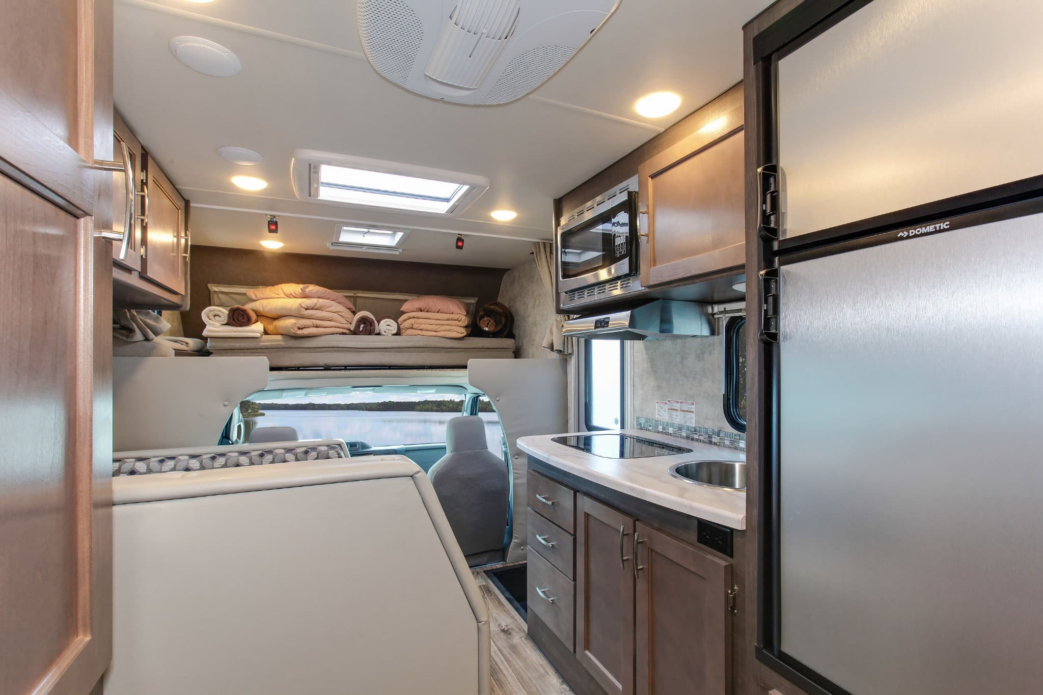 De C-Medium rijdt op een Ford E350 chassis met een krachtige V8- of V10-benzinemotor, wat zorgt voor een soepele en stabiele rit – ook op bergwegen of langere afstanden. De automatische transmissie en cruise control maken het rijden prettig, ook voor wie weinig ervaring heeft met grotere voertuigen. Een achteruitrijcamera helpt bij het manoeuvreren op smalle campings of parkeerplaatsen.