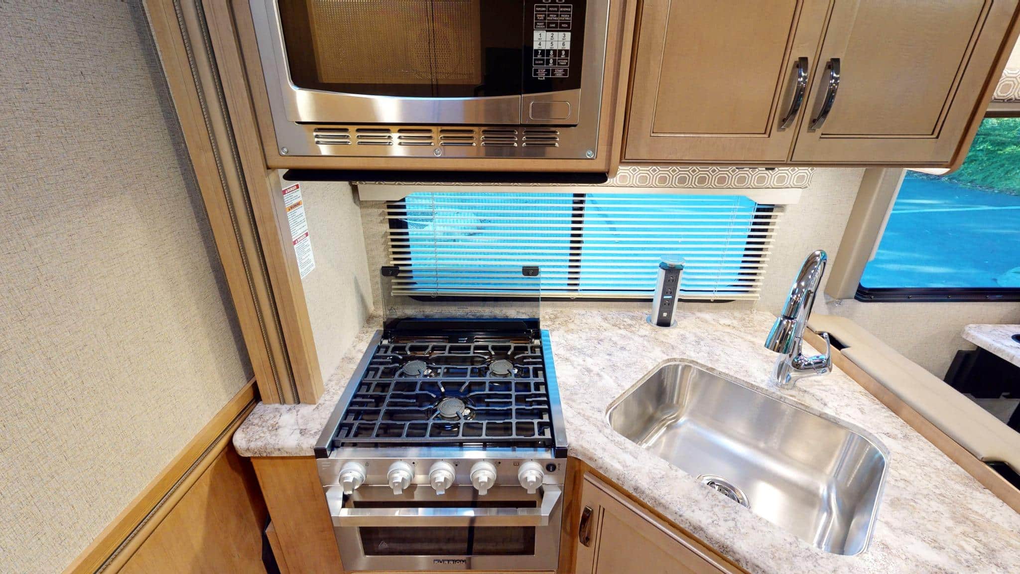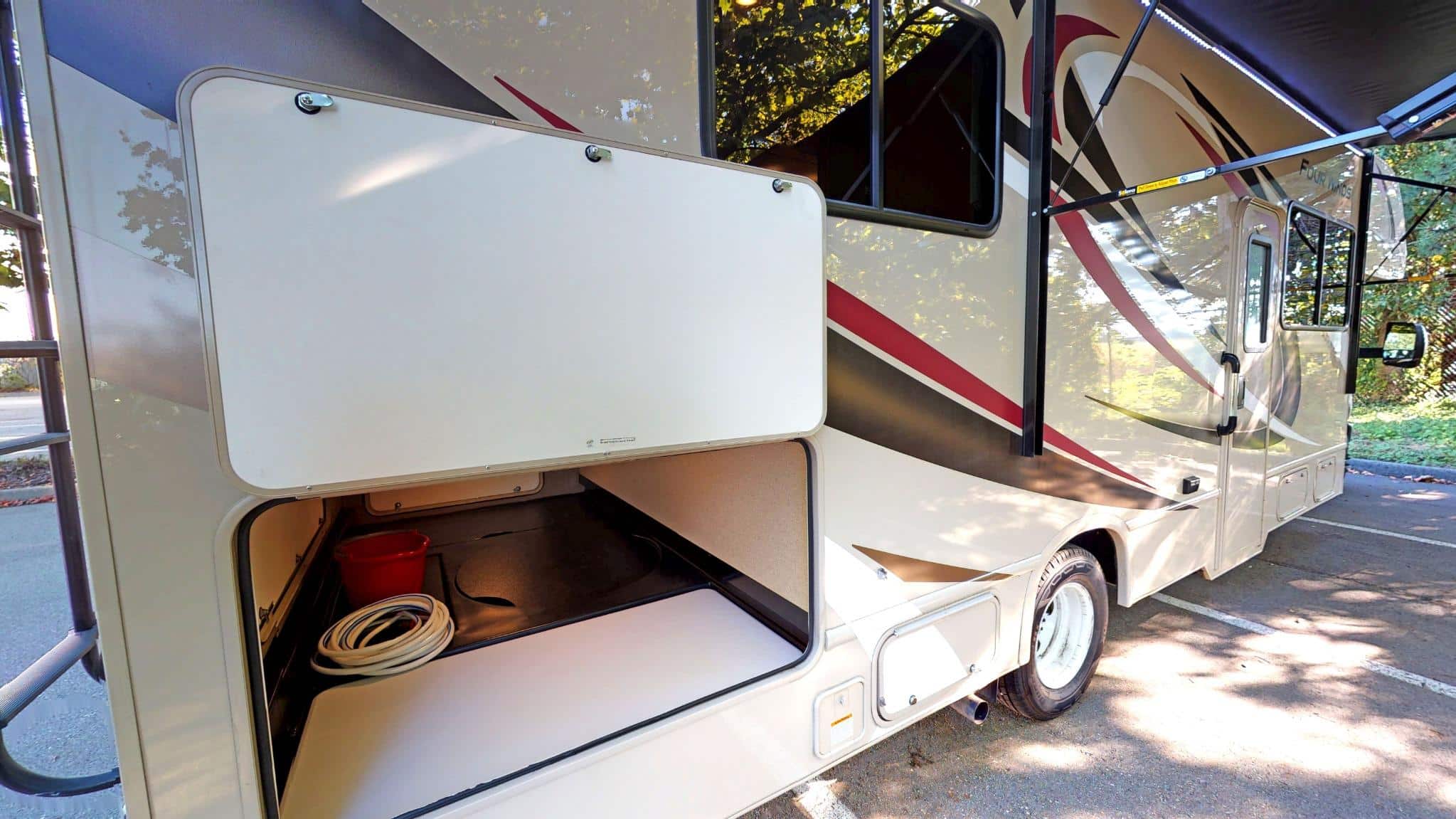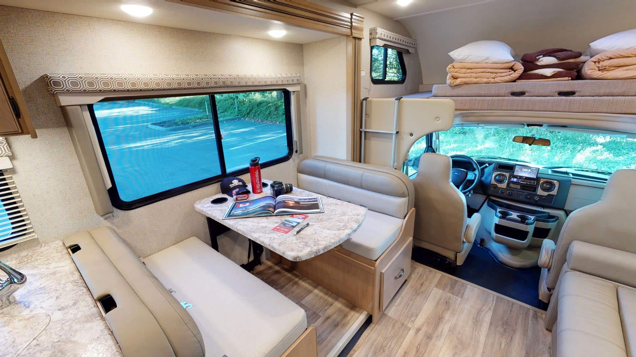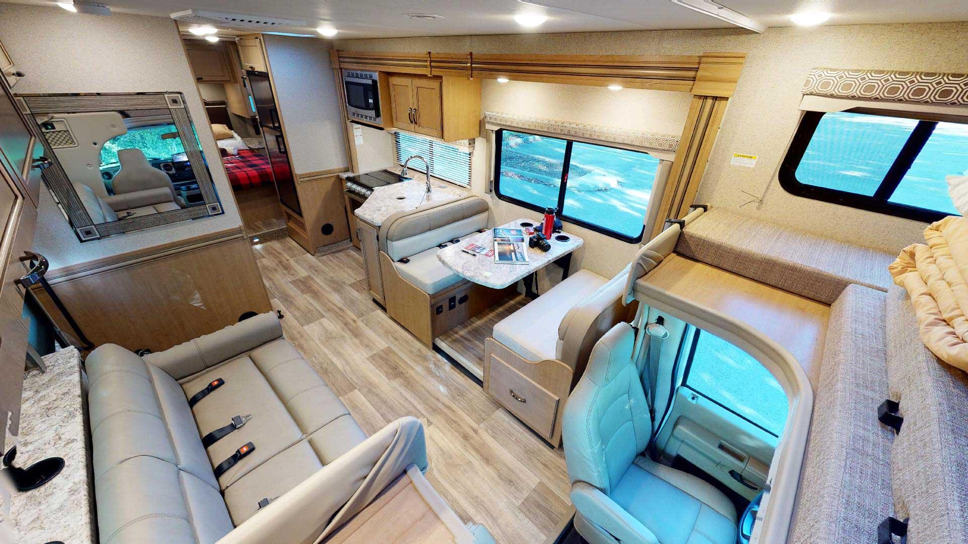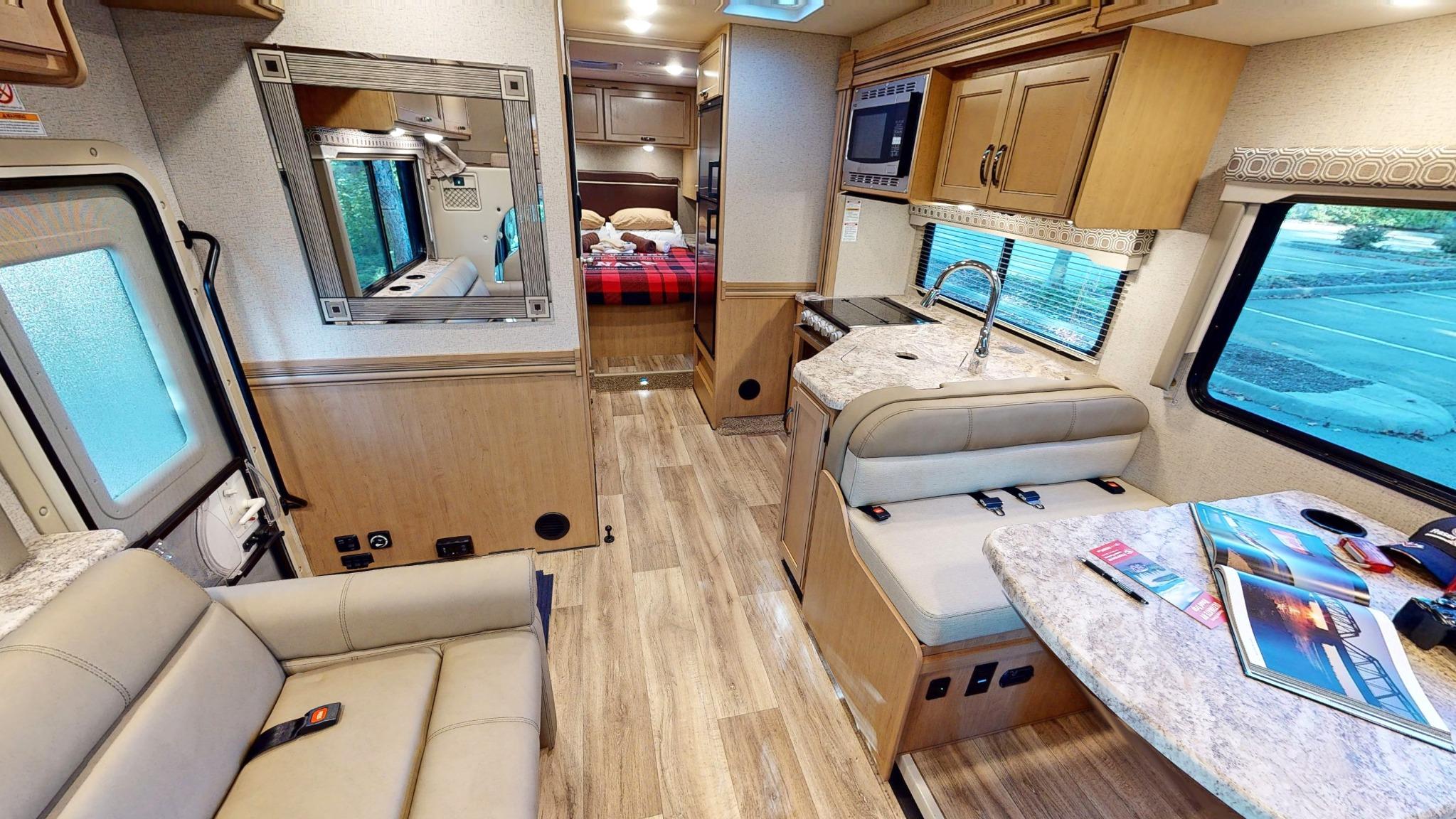 Ondanks het formaat is de camper verrassend soepel te rijden, dankzij het krachtige Ford E450-chassis, automatische transmissie en achteruitrijcamera.