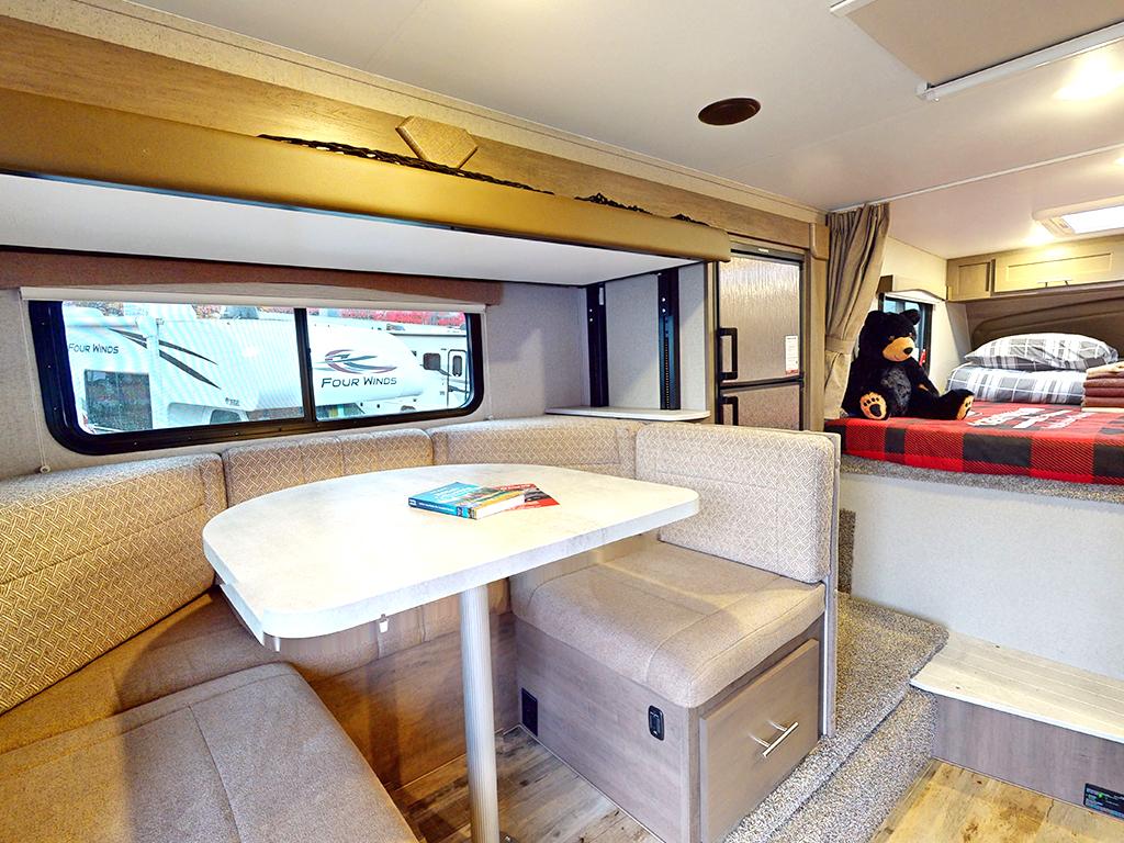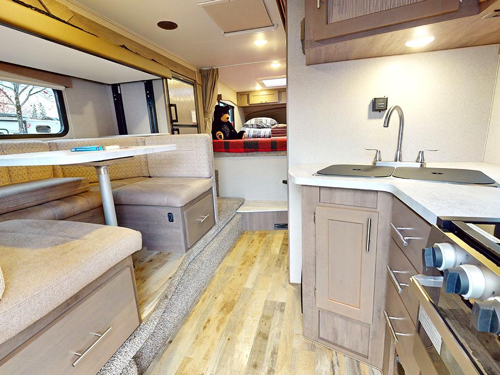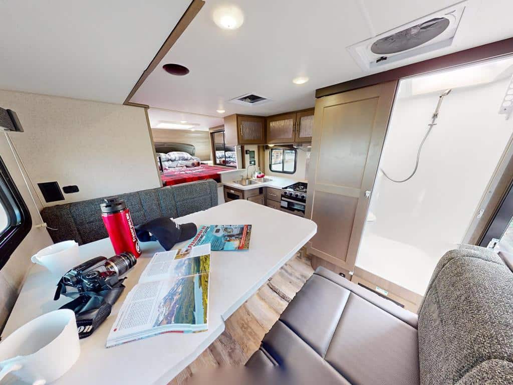 Deze uitvoering heeft een uitschuifbare zithoek. Op de camping creëer je hiermee extra ruimte om te zitten en te bewegen. Dat merk je vooral tijdens langere avonden binnen of bij minder goed weer, wat in Canada regelmatig voorkomt.