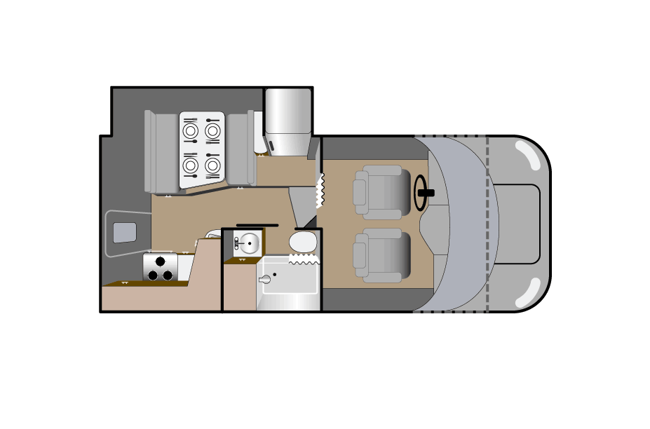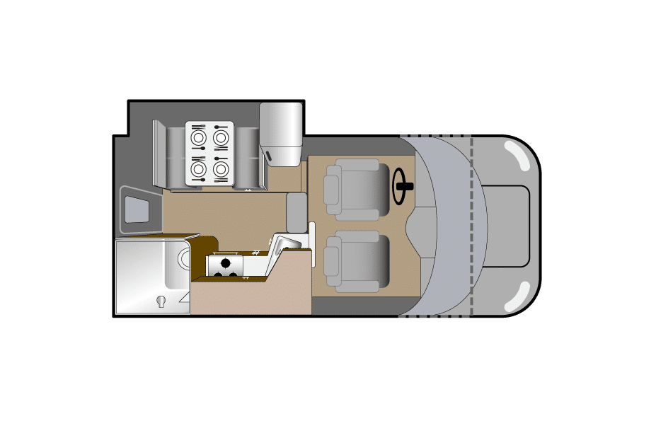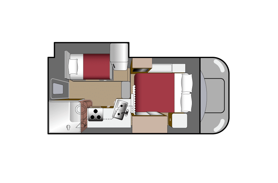 Dit is de meest compacte uitvoering zonder slide-out. Alles zit dicht op elkaar, maar is praktisch ingedeeld. Je bent snel klaar om te vertrekken en hebt weinig handelingen nodig bij aankomst op een camping. Geschikt voor reizigers die veel onderweg zijn en weinig binnen zitten.