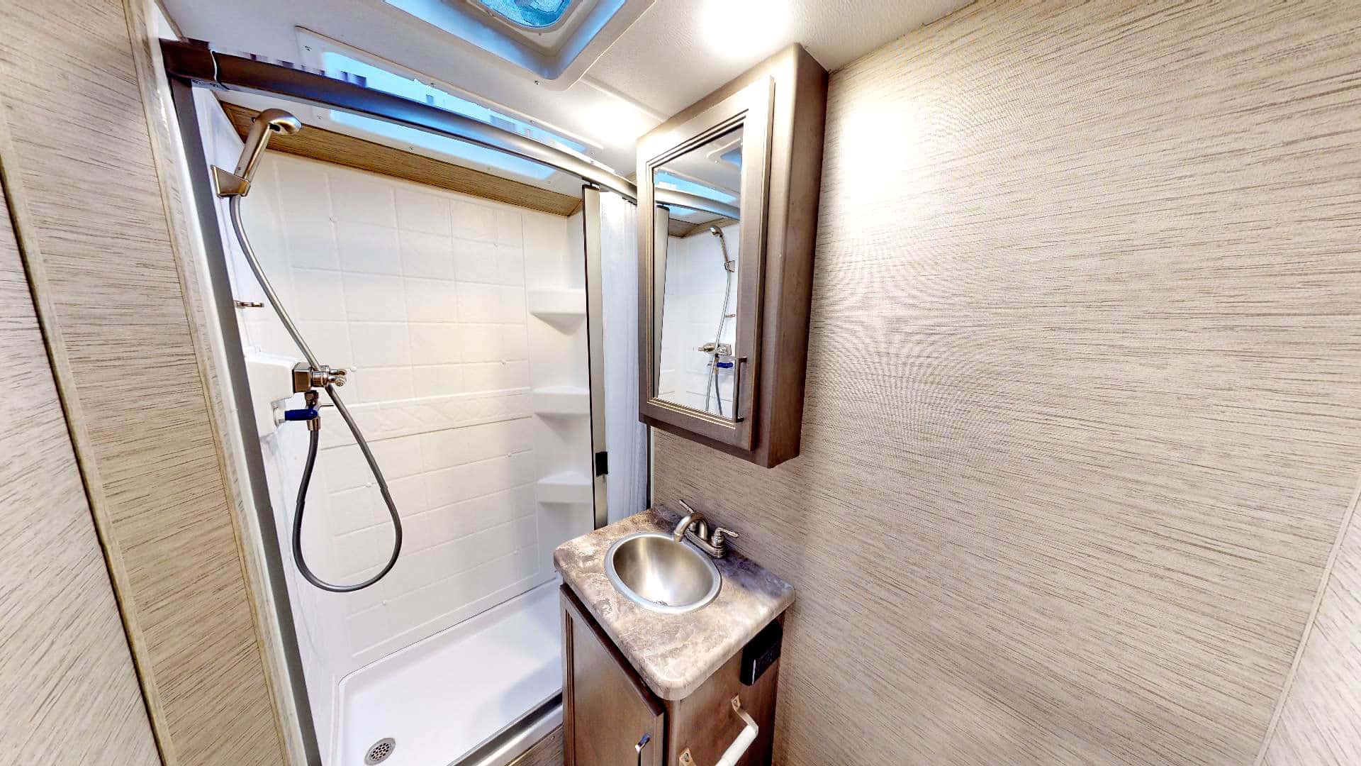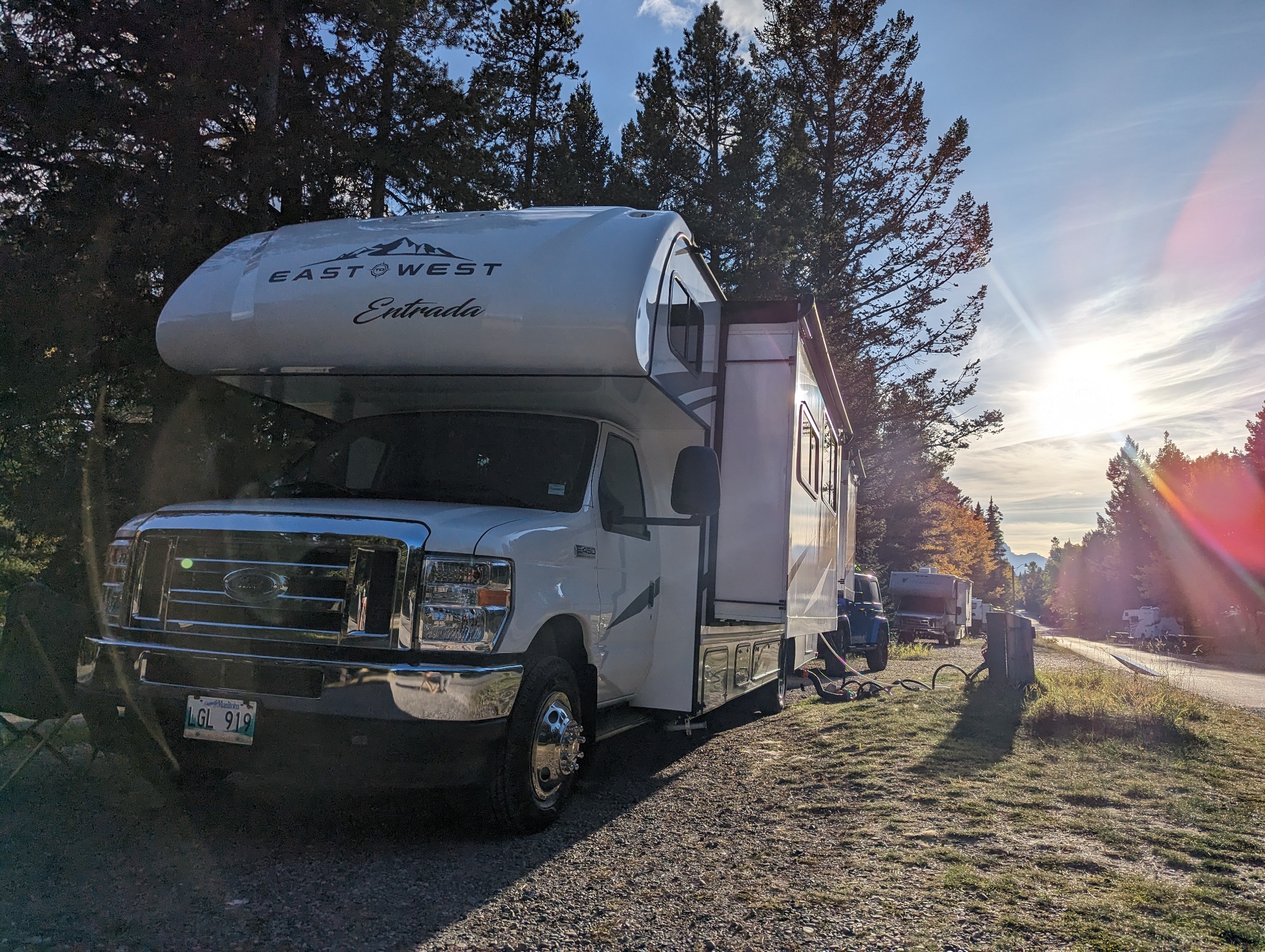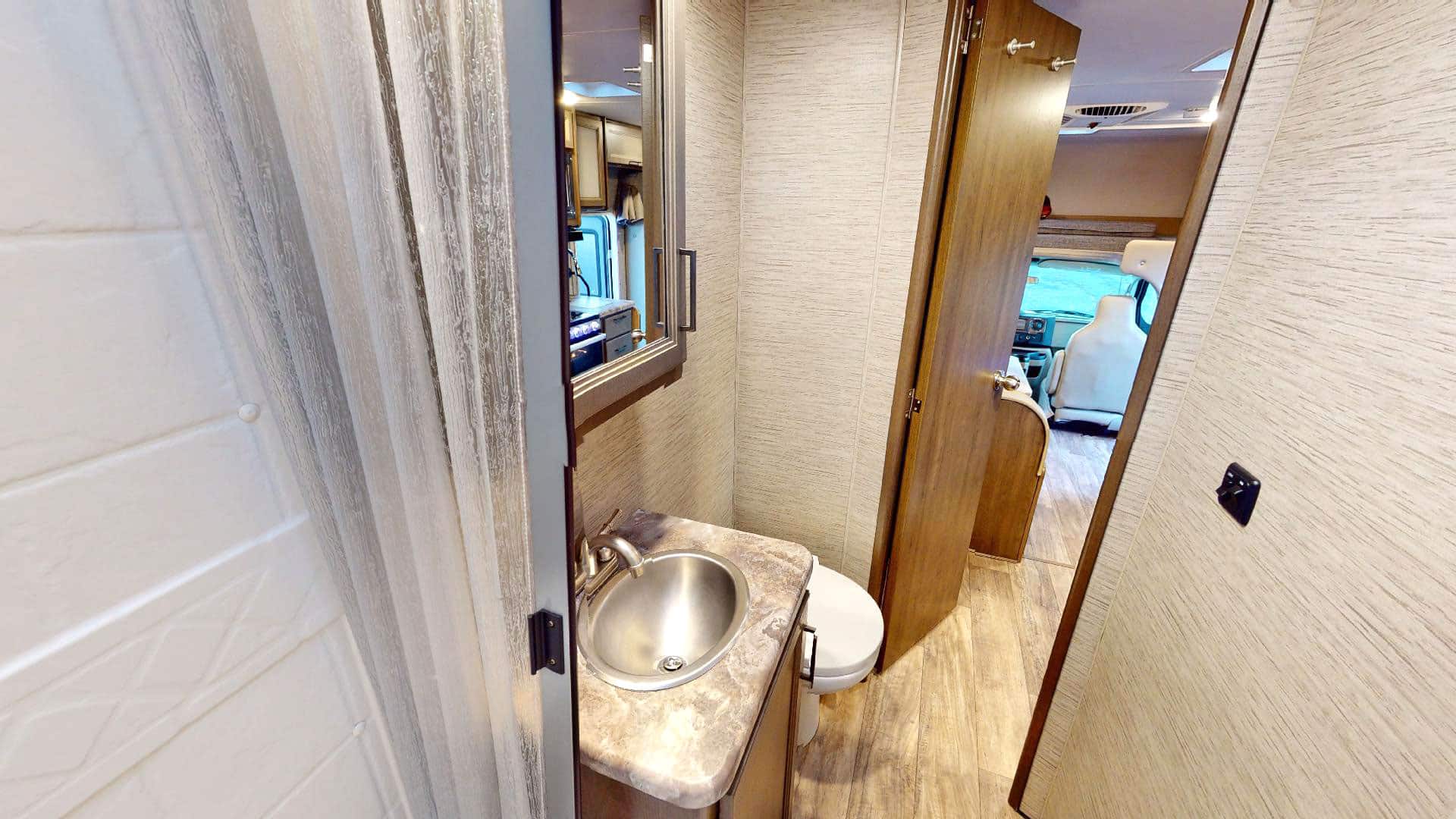 De camper is gebouwd op een Ford E350 of E450 chassis, met een sterke V8 of V10 benzinemotor. Dankzij de automatische transmissie, cruise control en een goede wegligging is hij ook geschikt voor mensen zonder eerdere camperervaring. De achteruitrijcamera helpt je bij het parkeren – geen overbodige luxe op campings of bij tankstations.