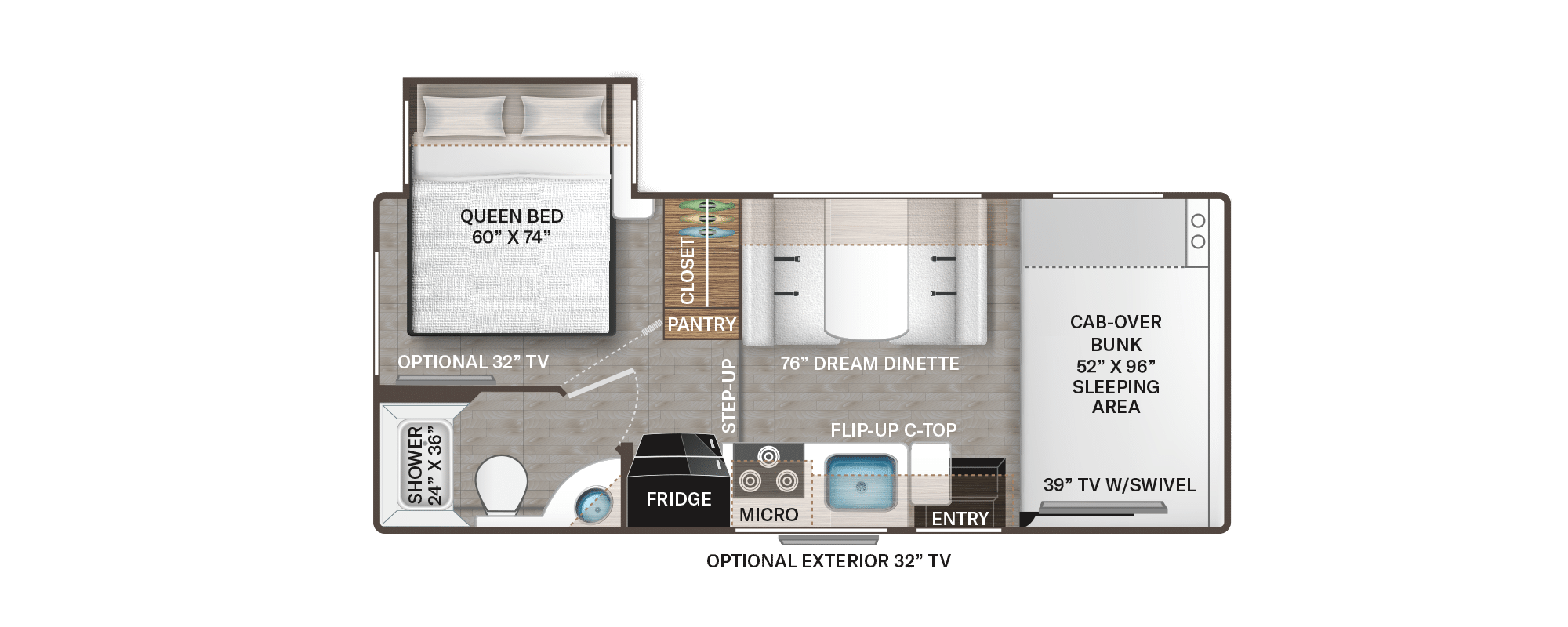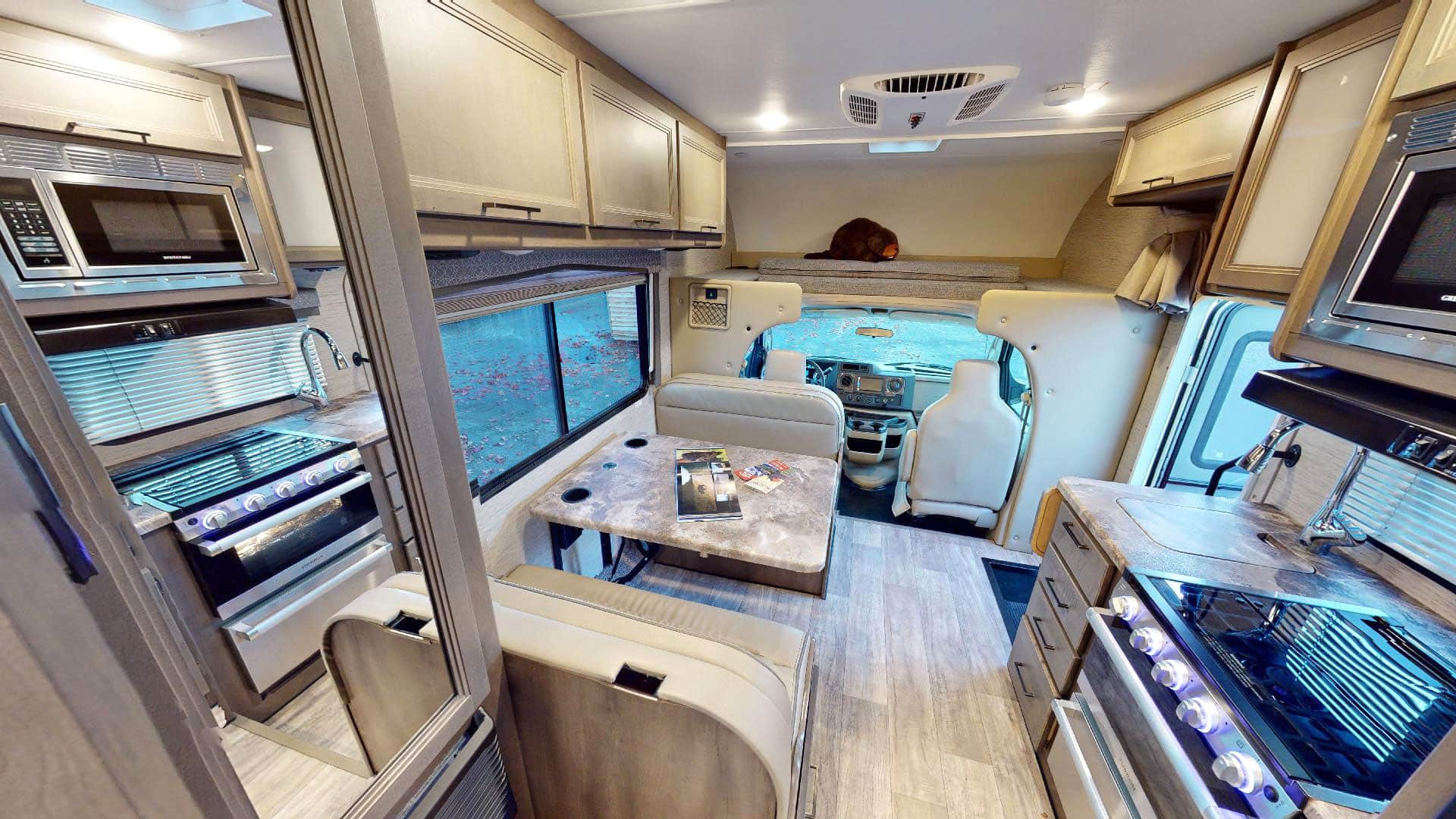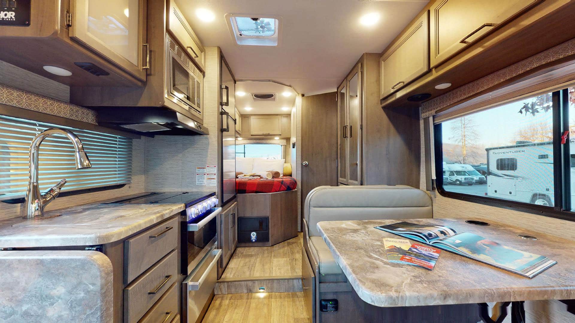 De meeste modellen hebben drie bedden (cab-over, dinette, achterbed) en zijn geschikt voor vier tot vijf personen.