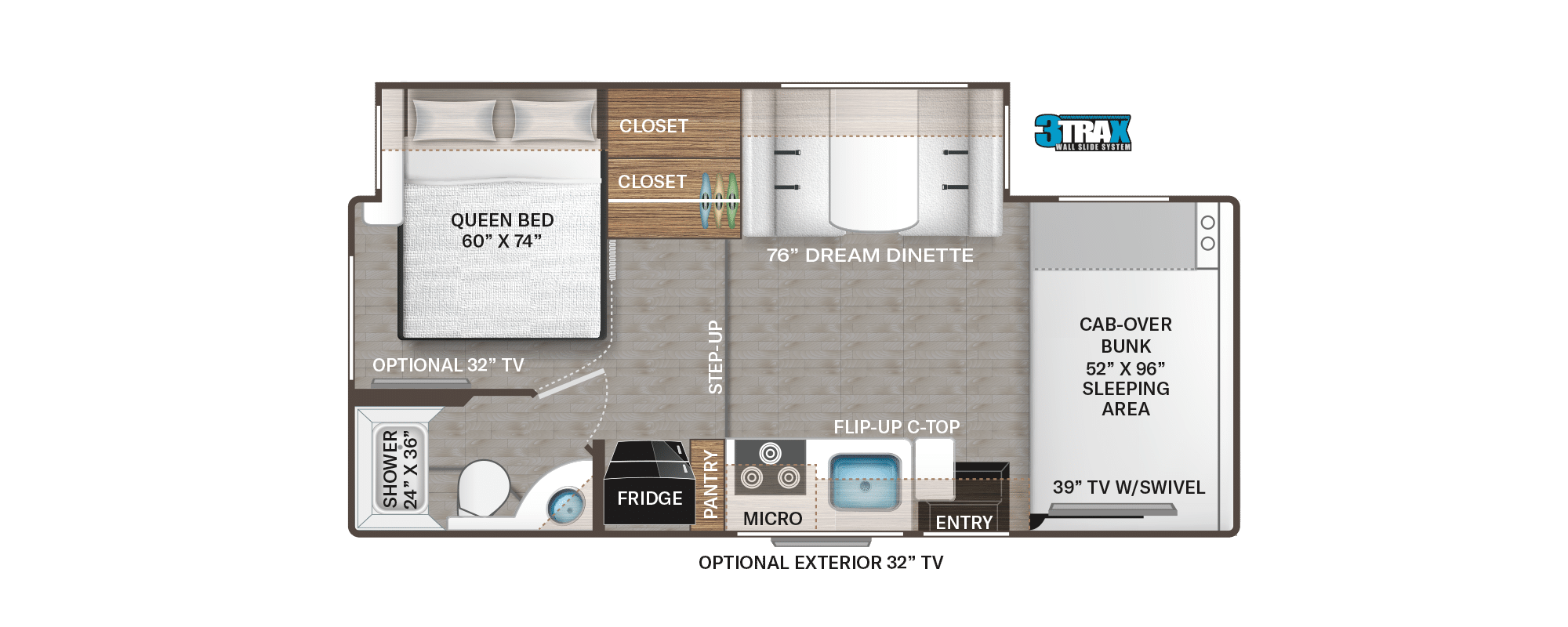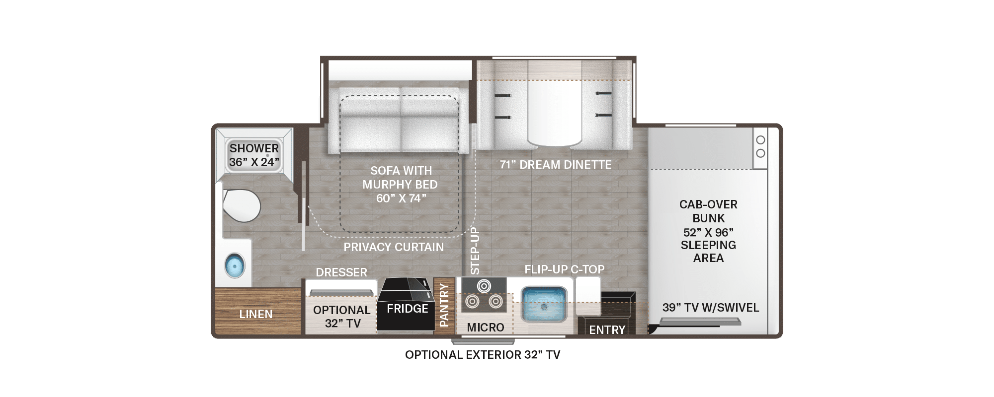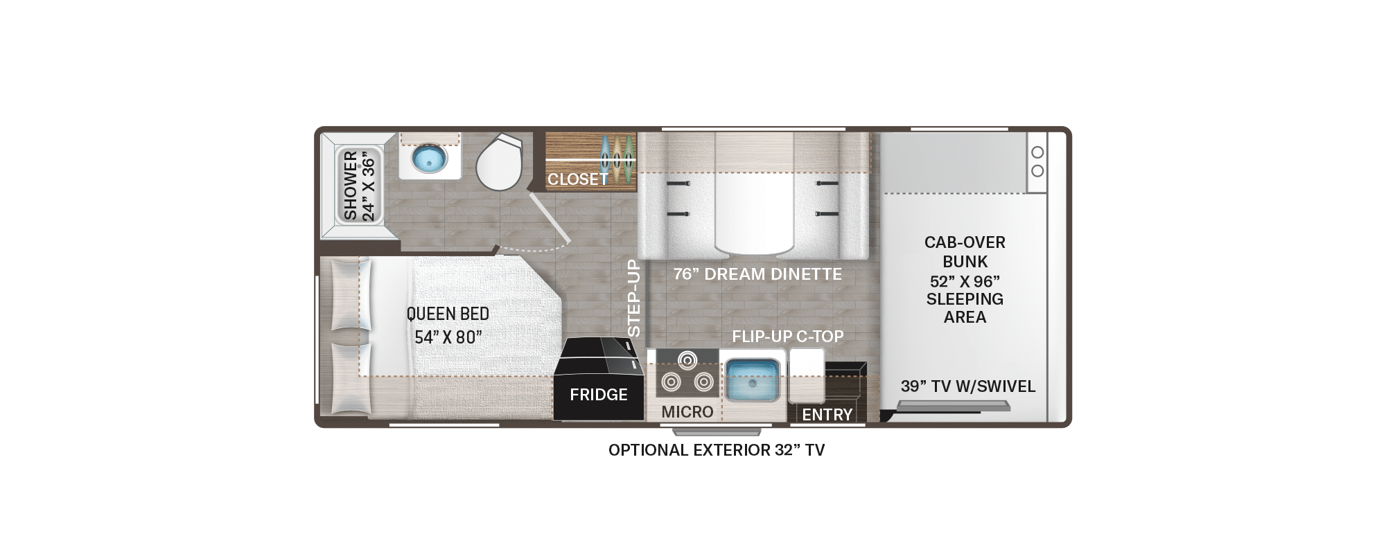 De meeste modellen hebben drie bedden (cab-over, dinette, achterbed) en zijn geschikt voor vier tot vijf personen.
