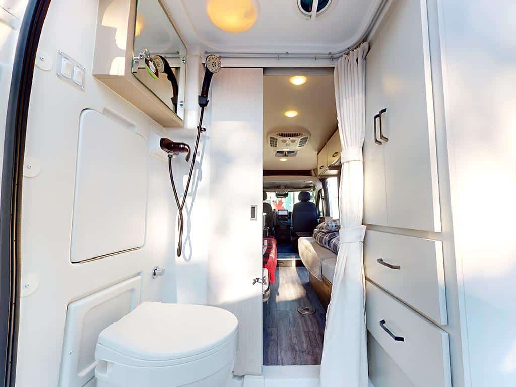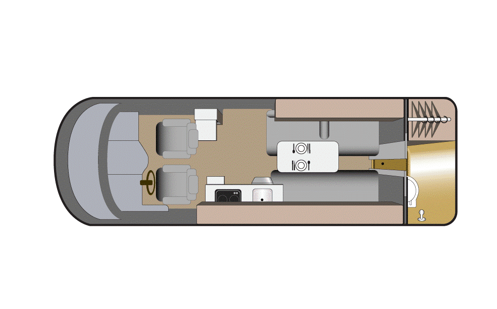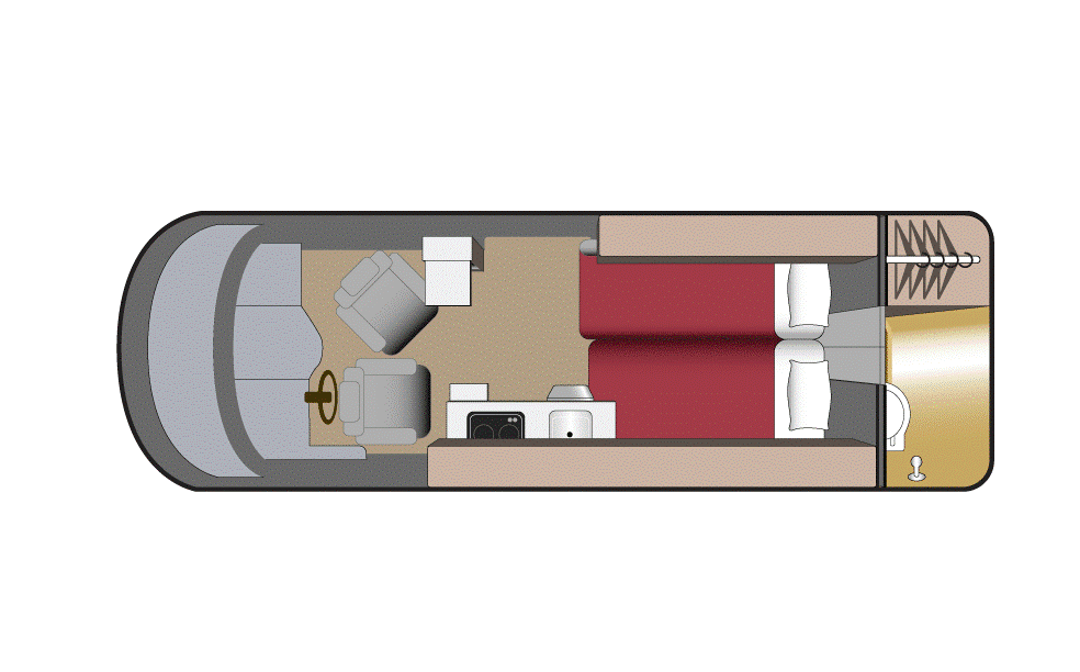 Ook qua faciliteiten zit je goed. Je hebt een kleine keuken met koelkast (incl. vriesvak), magnetron en 2-pits gasfornuis. Er is een eigen badkamer met douche en toilet, waardoor je ook op campings zonder voorzieningen prima uit de voeten kunt. Een furnace (verwarming) en airco maken het aangenaam in zowel warme als koude omstandigheden.