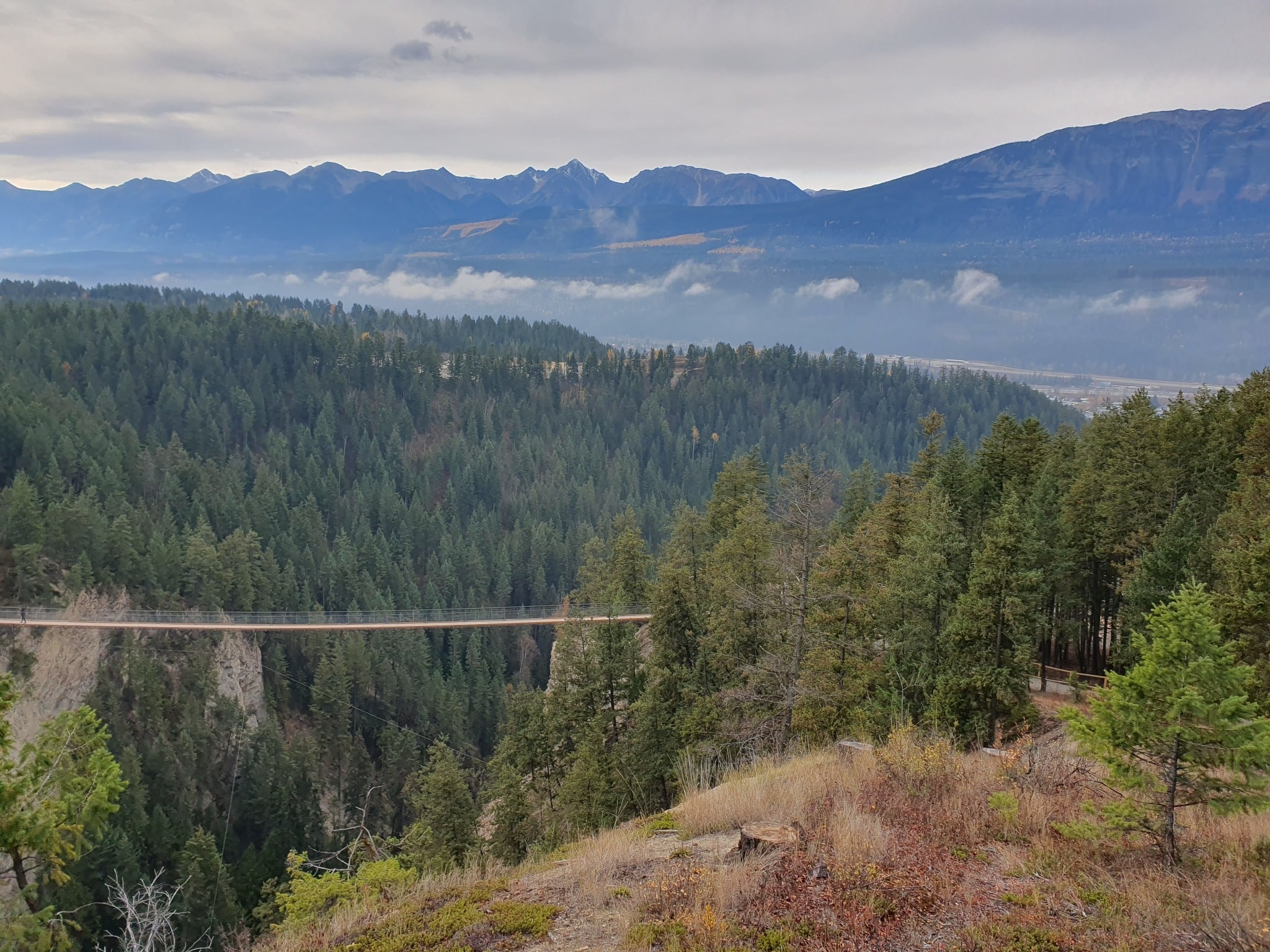 De houten voetgangersbrug over de Kicking Horse River verbindt het centrum met wandelpaden aan de overkant. Het is een korte wandeling, maar wel eentje die je een goed beeld geeft van de rivier en de ligging van het dorp in de vallei. In de zomer zie je hier rafters voorbij komen, in het voorjaar is het water vaak woester door smeltwater.