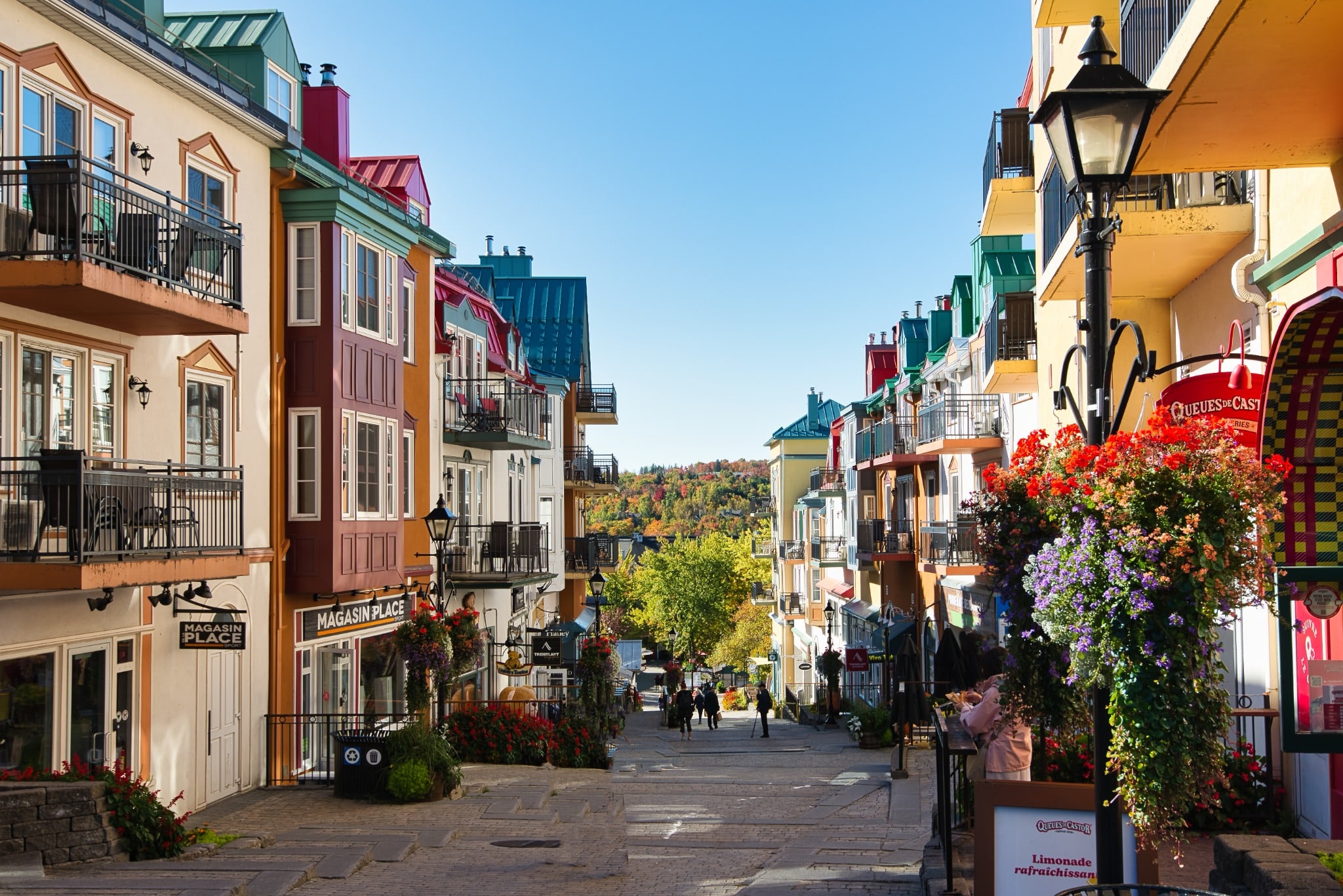 Het bergdorp is bewust ontworpen als centrale ontmoetingsplek. De gebouwen hebben kleurrijke gevels in rood, geel en groen, geïnspireerd op Europese bergarchitectuur maar aangepast aan de Canadese schaal. Je loopt hier over brede promenades met uitzicht op de skiliften in de winter en de mountainbikeroutes in de zomer. Restaurants serveren zowel Québécoise klassiekers als internationale gerechten. Denk aan poutine met lokale kaas of vers gegrilde zalm uit de regio.