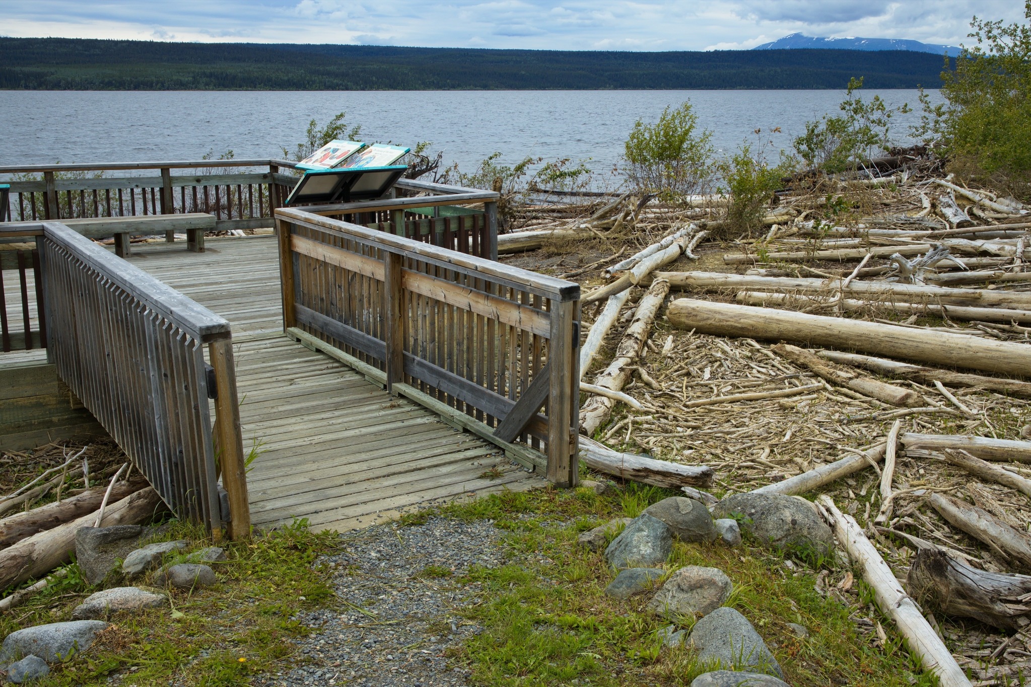 Verder richting Watson Lake vind je kleine recreatiegebieden langs de highway waar je kunt picknicken met uitzicht op meren en bossen. Het zijn eenvoudige plekken met houten tafels en vaak een informatiebord.